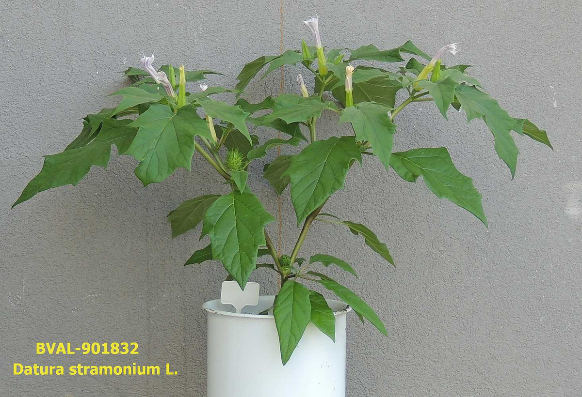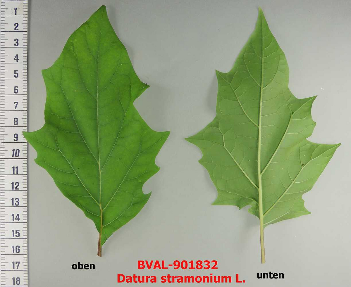 GIFTPFLANZE; Stramoniumblätter (Stramonii folium laut Pharma laut Pharmacopoeia Europea), bestehend aus den getrockneten Blättern oder aus den getrockneten Blättern mit blühenden und gelegentlich Früchte tragenden Zweigspitzen von Datura stramonium L. und seinen Varietäten (Unterarten); eingestelltes Stramoniumpulver (Stramonii pulvis normatus laut Pharmacopoeia Europea), aus pulverisierten Stramoniumblättern und, falls erforderlich, auf einen Gesamtalkaloidgehalt zwischen 0,23 und 0,27 % eingestellt -